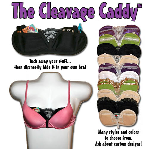 The Cleavage Caddy is an insert for your bra so you can discretely stash things like credit cards, ID, keys, lipstick and more. Discretely? Really?