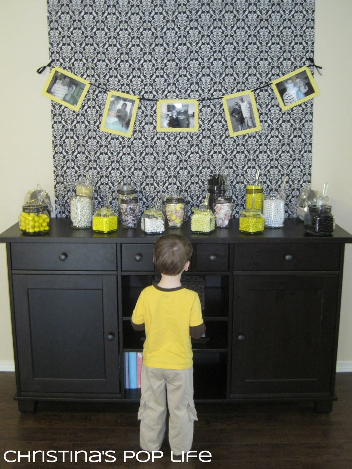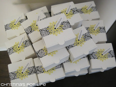 I'm no Amy Atlas, but I think it turned out pretty well for my first candy buffet. The boxes were adorably designed by my sister's oldest friend. They were so cute! I need to get some apothecary jars to add some height to the table next time. Either way, the guests loved loading up on goodies to take home and the bride to be had a lot of fun.